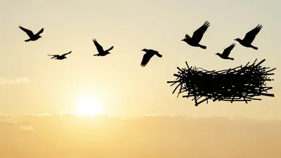 – Images of birds flying at dawn over water, symbolizing new beginnings and freedom.