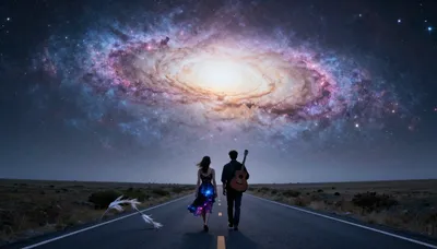 Step into a world of romance and wonder with our captivating romantic night scene picture. This image beautifully portrays a couple walking hand-in-hand on a deserted highway, bathed in the ethereal glow of a magnificent galaxy. It's a perfect visual for anyone looking to evoke feelings of love, adventure, and cosmic connection. Use it as a desktop background, a social media post, or as inspiration for your next creative endeavor. Let this image transport you to a magical night under the stars! ✨